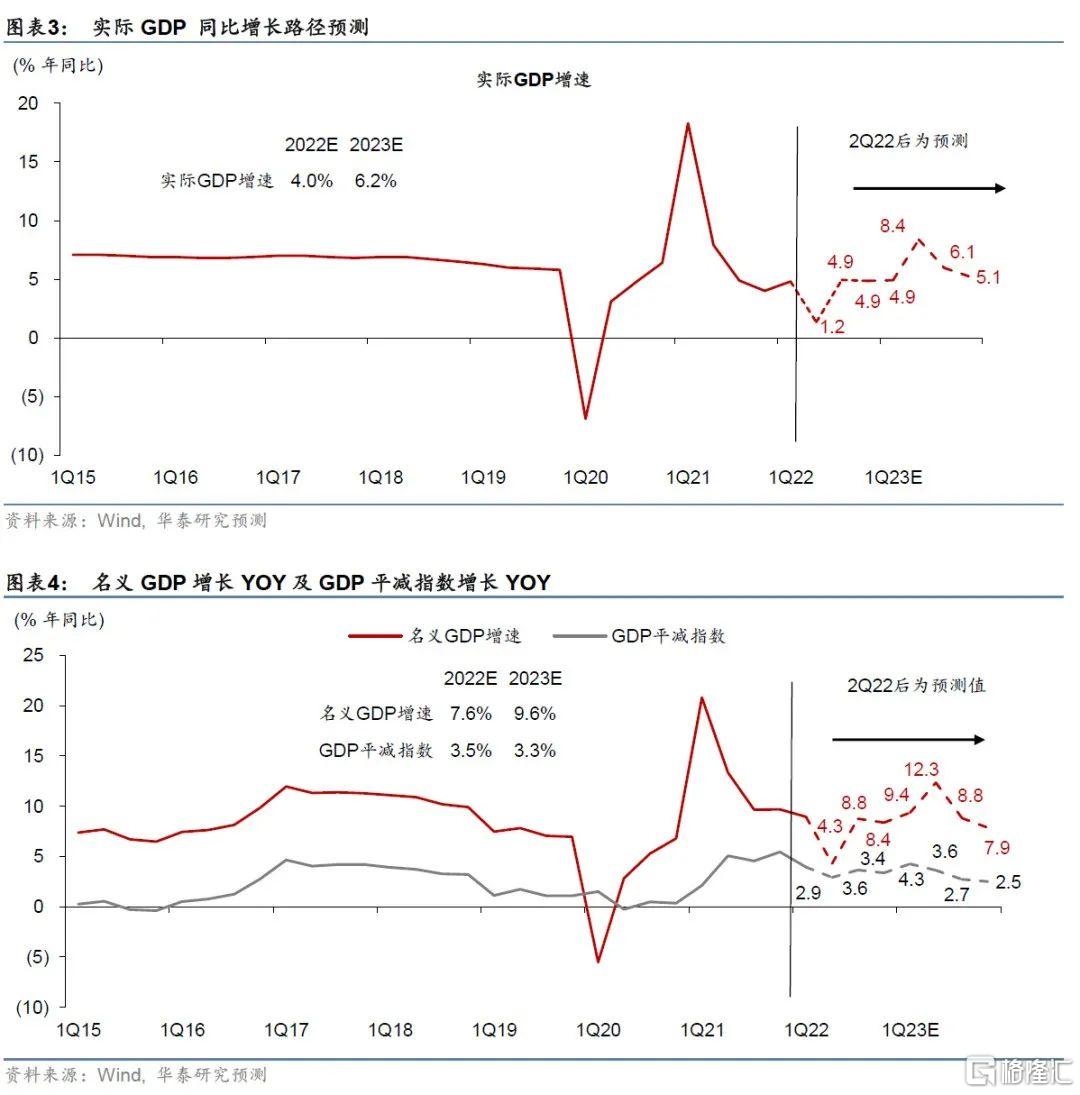 由於疫情、政策等各方面因素對2020-2021基數擾動很大,數學上,我們環比增長假設倒推的同比增長路徑其實受基數影響更大——具體看,預計2022年2季度-4季度的實際GDP同比增長分別爲1.2%,4.9%,4.9%(全年4%)。而2023年4個季度同比增長爲4.9%,8.4%,6.1%,5.1%(全年6.2%,圖表1)。