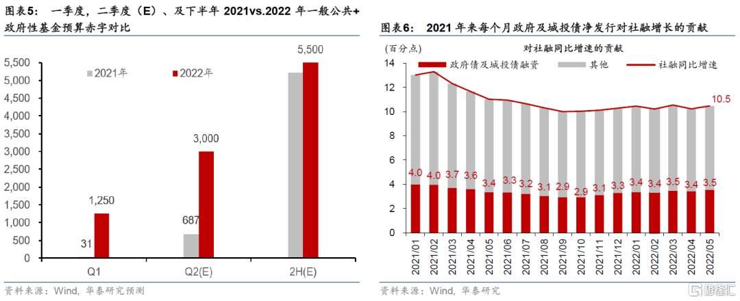 我們本套假設隱含的政策路徑假設爲2022年5-7月之間,穩增長政策力度最大,季度上看,對2022年2季度的財政赤字率以及社融增長的拉動效應最爲明顯。2022年4-5月,一般公共預算+政府性基金預算赤字分別達到8,068億和9,138億,比2021年4-5月的盈餘3,310億累計增加約2萬億,6月兩項財政赤字同比可能再度大幅擴張。由此,2022上半年兩項赤字擴張總額可能達到3.5-4萬億元。然而,由於2022人大公佈的全年一般公共和政府性基金預算赤字同比僅增加3.8萬億元,即使計入央行上繳一萬億及此前結轉資金,2022全年兩項赤字總額擴張的實際上限也可能僅4-5萬億元,即2022下半年剩餘財政擴張空間明顯收窄,且全年財政擴張同比幅度最大的季度爲2季度(圖表5,有關財政政策及路徑的具體討論,請參見第19頁的第5部分)。