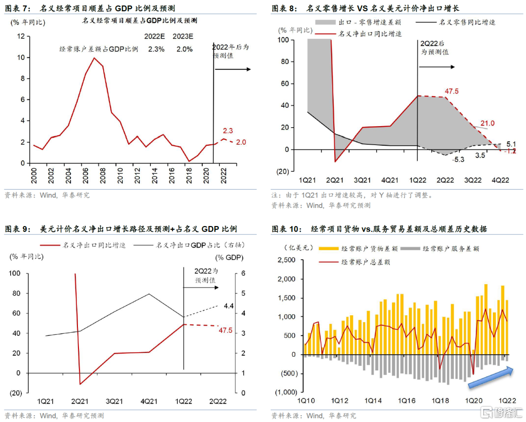 1. 以需求法GDP分解各部門對總需求增長的拉動,2022上半年淨出口對增長的拉動較大,尤其在2季度,但我們預計內需貢獻有望在2022下半年回升,其中投資先行,消費次之。淨出口量對總需求增長的貢獻可能逐季下降,且如果2023年國際人員交流有效重啓,服務項下逆差可能拖累經常項目差額對增長的貢獻在2023年轉負(圖表7)。