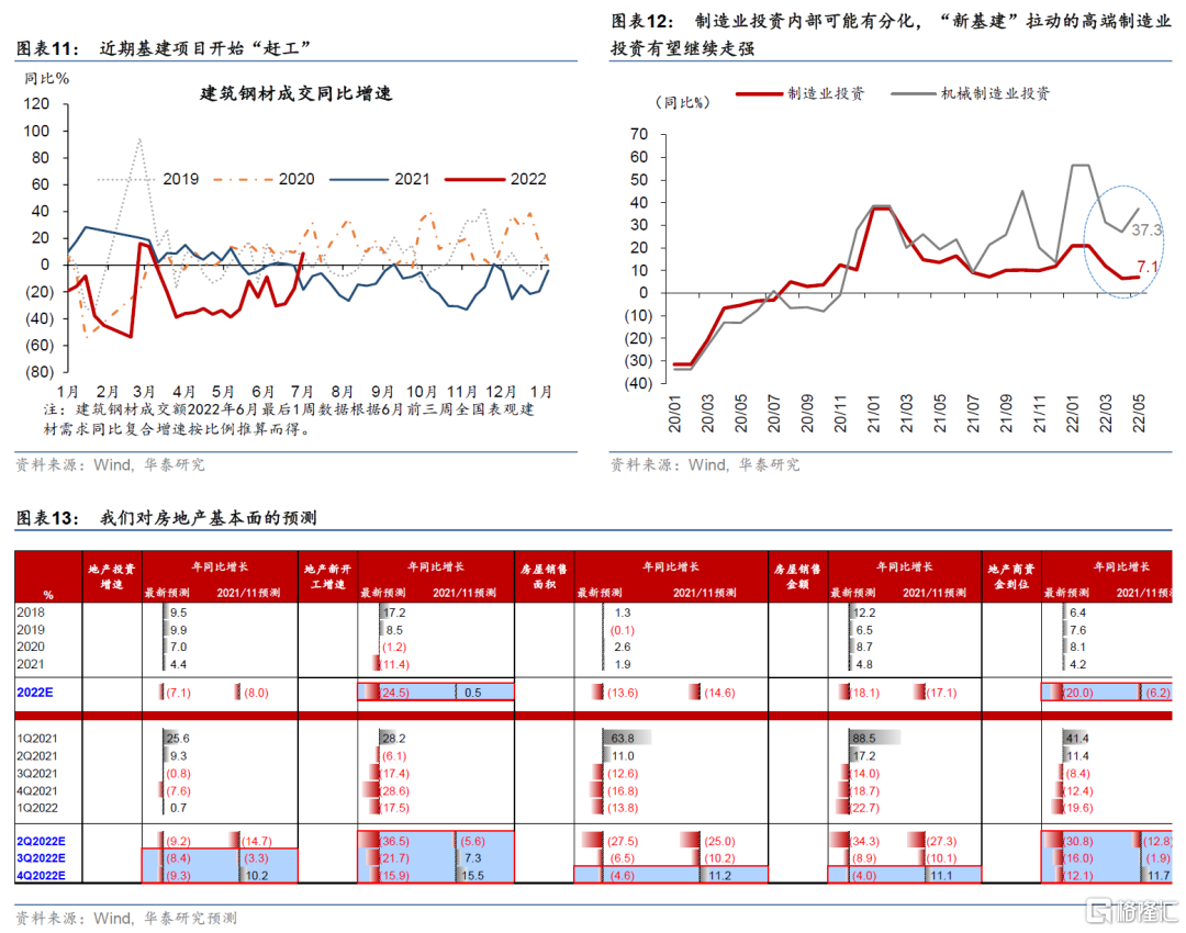 1)預計(統計局月報的)城鎮固定資產投資同比增長在2022年下半年加速,主要是廣義基建投資拉動。2022年全年城鎮固定資產投資同比增長在7.5%附近,2-4季度分別爲4.7%、9.2%和8.0%;2023年固定資產投資增速則可能回落至6%左右。短期內,廣泛意義上的基建投資是投資回升的最大推動力——傳統基建投資,以及“新基建”涵蓋的電力新能源、國防和農業水利等領域均有回升空間。今年6月底地方專項債發行完畢(2022年額度),疊加央行前期發放的各類再貸款, 6月1日國務院宣佈調增政策性銀行8000億元信貸額度帶來增量資金,以及6月30日新增的3000億重大項目資本金,基建投資資金來源較爲充裕。今年2季度,疫情導致基建投資實際施工受到影響,但近期明顯有“趕工”跡象,如水泥企業開工率逆季節性小幅回升,建築鋼材成交大幅回升(圖表11)。由此,我們預計基建投資增速有望從2季度的6%左右加速至下半年的10%以上。從投向上看,除傳統交通、城市基礎設施等領域,電力新能源、水利、農業等領域均可能是基建投資發力的主要方向。尤其值得強調的是, “新基建”中有相當一部分投資可能落在“製造業投資”中,因此製造業投資內部可能產生分化,但總體增長相對穩健、全年有望維持在8%左右:一方面高端製造業、能源及農業產業鏈等的投資有望獲得政策支持、增長加速,且今年1.64萬億的增值稅留抵退稅對企業現金流形成補充;但另一方面,隨着企業盈利的走弱,部分行業投資增速可能會從此前的高位回落(圖表12)。