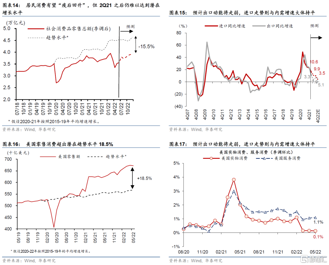 3)2022年下半年居民消費有望“疫後回升”,但難以達到潛在增長水平。地產週期和疫情防控仍是拖累,雖然其影響將較2季度明顯減輕。我們預計2022年全年社會消費品零售總額增速可能僅爲1.7%左右,2-4季度分別爲-5.3%、3.5%和5.1%,距離疫情前水平仍有較大差距(圖表14)。疫情平穩後,服務消費所受衝擊正在“脈衝式“減弱——人流數據顯示2022年6月城市內交通較4-5月明顯反彈。6月28日國務院發佈《新型冠狀病毒肺炎防控方案(第九版)》,將密切接觸者、入境人員隔離管控時間從“14天集中隔離醫學觀察+7天居家健康監測”調整爲“7天集中隔離醫學觀察+3天居家健康監測”;6月29日工信部宣佈取消通信行程卡“星號”標記,同時上海宣佈將於7月8日有序恢復電影院開放及各類公共文化場所。這些措施標誌着本輪疫情對生產生活的影響正在顯著消退。
