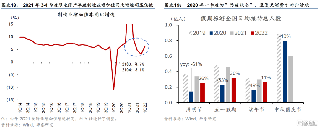 1)製造業增加值增速可能在2021下半年低基數的提振下更爲亮眼。2021年3季度“能耗雙控”政策持續升級,江蘇、廣東、福建、東北等多地出臺嚴格限電限產政策,工業生產受到顯著壓制。2021年3-4季度,製造業增加值同比增速僅4.7%和3.1%(圖表18)。由此,今年下半年經濟的復甦加上低基數有望雙雙提振生產增速。不過,原材料成本高企、外需增長減速等因素可能在一定程度上抑制製造業增加值和盈利反彈的“高度”、以及總體製造業產能擴張的力度。製造業中,預計高科技、工業原材料、新能源、甚至部分傳統能源改造升級等行業可能受高通脹及國家長期戰略驅動,產值回升及產能擴張動能更強。