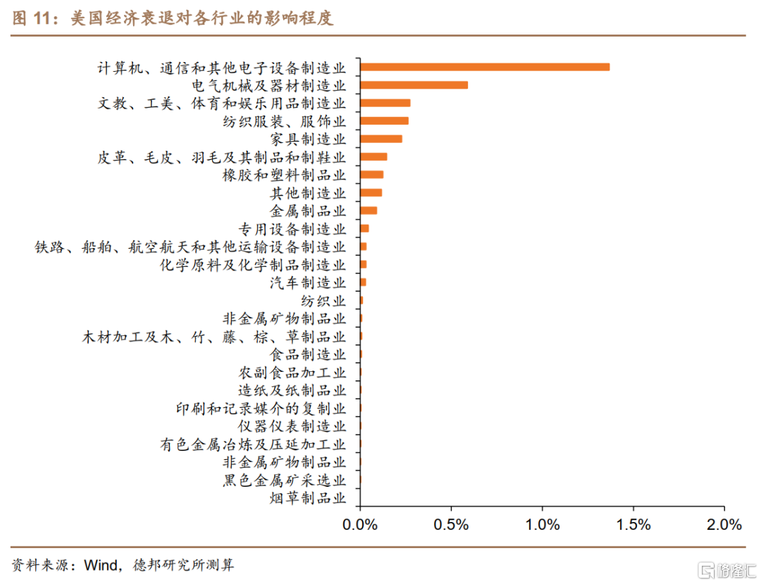綜合對歐美出口依賴度的分析來看,歐美經濟衰退對我國計算機通信和電子設備製造業以及電氣機械及和器材製造業最爲明顯,且顯著高於其他行業;此外,紡織服裝業、文娛用品製造業、傢俱製造業和皮革製鞋業等勞動密集型行業也會一定程度上受到歐美經濟衰退的影響,而其他大部分行業對於歐美需求端變動的敏感度較低,受歐美經濟衰退的影響相對較小。