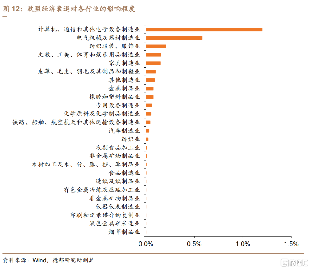 同樣地,我們通過行業出口依賴程度、產品出口對歐盟依賴程度以及產品出口佔我國全部出口比重這三部分相乘測算了各行業受歐盟經濟衰退的影響程度。