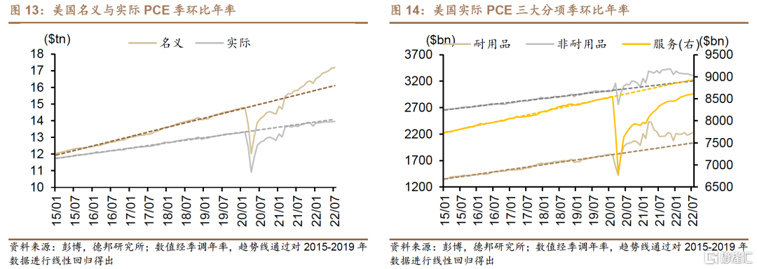 從目前美國居民部門名義與實際PCE的最新狀況來看,7月名義PCE和實際PCE偏離度均出現邊際回落。其中名義PCE離趨勢線的偏離程度仍有6.7%,而實際PCE離趨勢線的偏離程度已經由年初的-0.4%回落至7月的-0.9%,這表明美國居民的消費力在“量”的層面已出現邊際回落,當前旺盛消費力的背後更多來自“價”的支撐。而具體到耐用品和非耐用品消費上,在絕對值的量綱上,耐用品與非耐用品的單月消費雖然仍保持強勁,但偏離度已出現向趨勢線水平的收斂(4月到7月,耐用品偏離度:11.0%→9.8%;非耐用品偏離度:4.7%→3.2%),反映在相對值的量綱上,這將逐步體現爲消費增速的轉負。