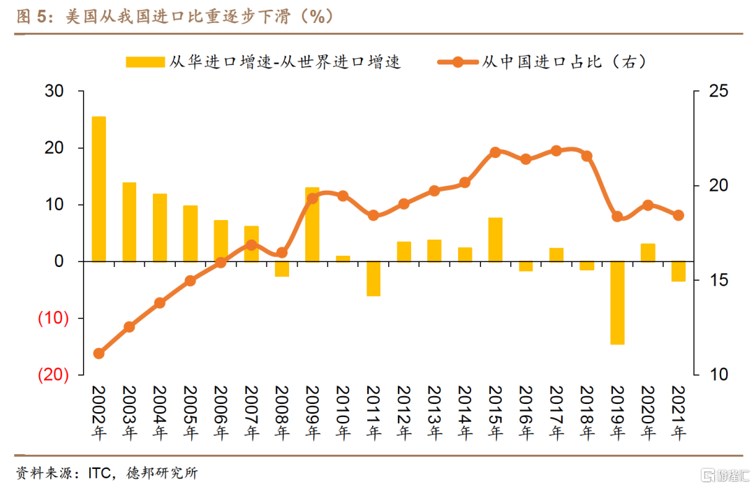 而從美國的角度來看,自2001年中國進入世貿組織以來,美國從華進口先是經歷了一段高速增長期(2002年-2007年),該期間美國從華進口增速遠高於其從世界進口增速,從華貨物進口佔其全部貨物進口的比重從2001年的9.0%增至了2007年的16.9%;而在2008年-2017年間,美國從華進口進入了一段平穩增長期,從華進口增速與從世界進口增速相差較小,而從華貨物進口佔其全部貨物進口的比重也從2008年的16.5%逐步增長至了2017年21.9%的歷史最高值。而在2018年中美貿易摩擦以來,美國對華進口逐步縮減,且從華進口增速低於其從世界進口增速,從華貨物進口佔其全部貨物進口的比例逐步下滑至2021年的18.4%。