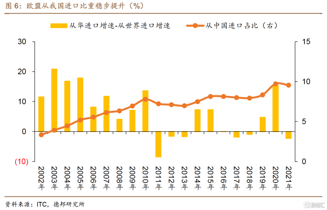 相比於美國,歐盟從華進口的佔比相對較低,但保持了較爲穩定的增長態勢。自2001年以來,歐盟自華貨物進口比重不足其全部貨物進口的一成,佔比從2001年的3.0%一直增長至2019年的8.4%。特別是疫情以來,我國在全球主要經濟體中恢復較快,爲全球供應鏈了穩定提供了重要支撐,使得歐盟從華進口比重進一步提升至2021年的9.6%。