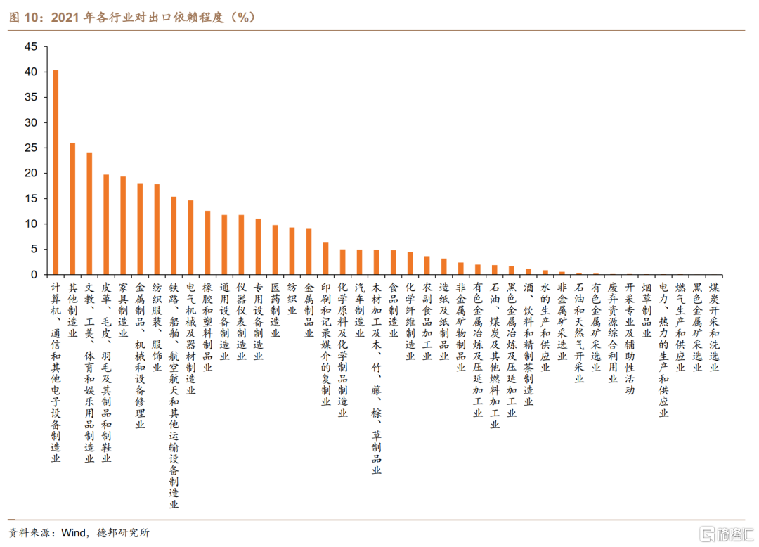 從2021年各行業出口交貨值佔營業收入的比重來看,電子設備製造業對於出口的依賴程度最高,佔比達到了40.4%。此外,包含玩具在內的文娛用品製造業、傢俱製造業、紡織服裝業以及電氣設備製造業等行業對於出口也具有較高的依賴程度。因此,當外需發生變動時,這些行業會相對較爲敏感,受到的影響也更大。