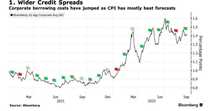 上週公佈的美國8月消費者價格指數(CPI)強於預期,鞏固了投資者們對美聯儲將於本週連續第三次加息75個基點的押注。除了通脹放緩之外,其他可能導致美聯儲收斂其強硬態度的潛在指標還包括信貸息差擴大、違約風險上升、債券市場流動性萎縮以及匯市動盪加劇。本文通過以下四張圖表對這些潛在指標進行更深入的分析。