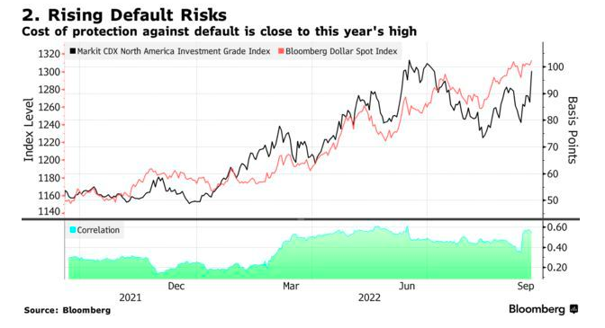 針對公司債務違約風險的保護成本激增同樣可能會嚇到美聯儲。Markit CDX北美投資級指數(Markit CDX North America Investment Grade Index)是一籃子投資級債券信用違約掉期的基準,今年以來該指數的價差已經翻了一番,達到約98個基點,接近6月份創下的2022年102個基點的高點。違約風險的增加與美元升值密切相關,而美元升值得益於美聯儲加速加息的步伐。
