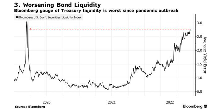 另一個可能促使美聯儲放慢緊縮步伐的威脅是國債流動性的萎縮。彭博的美國主權流動性指數接近自2020年初新冠疫情爆發以來的最糟糕水平。摩根大通測算的美國十年期國債的市場深度也降至2020年3月的水平,當時交易員們甚至都難以爲流動性最強的政府債券找到價格。
