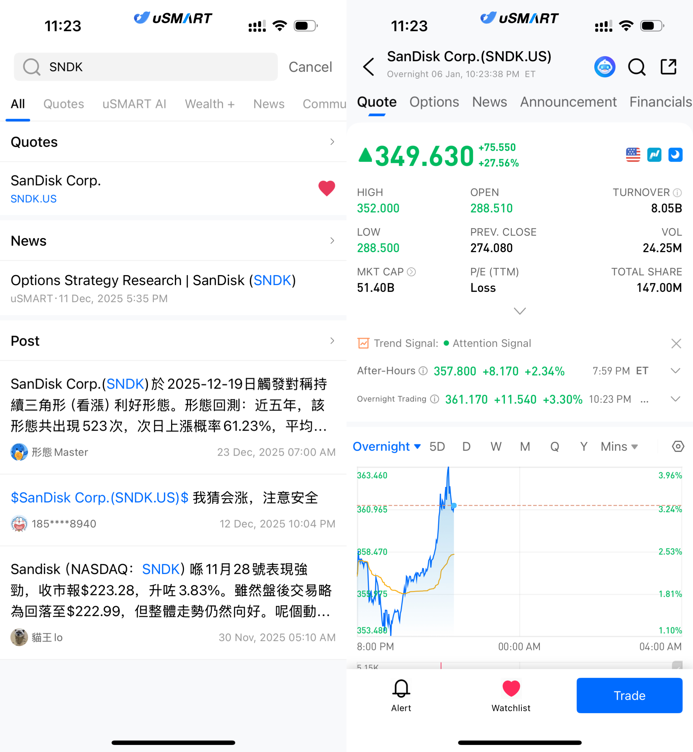 After logging into the uSMART HK app, click the “Search” button in the top-right corner of the page, enter the ticker code (SanDisk.US), and navigate to the details page to view transaction details and historical trends. Click the “Trade” button in the bottom-right corner, select the trade type, and submit your order after filling in the transaction conditions.