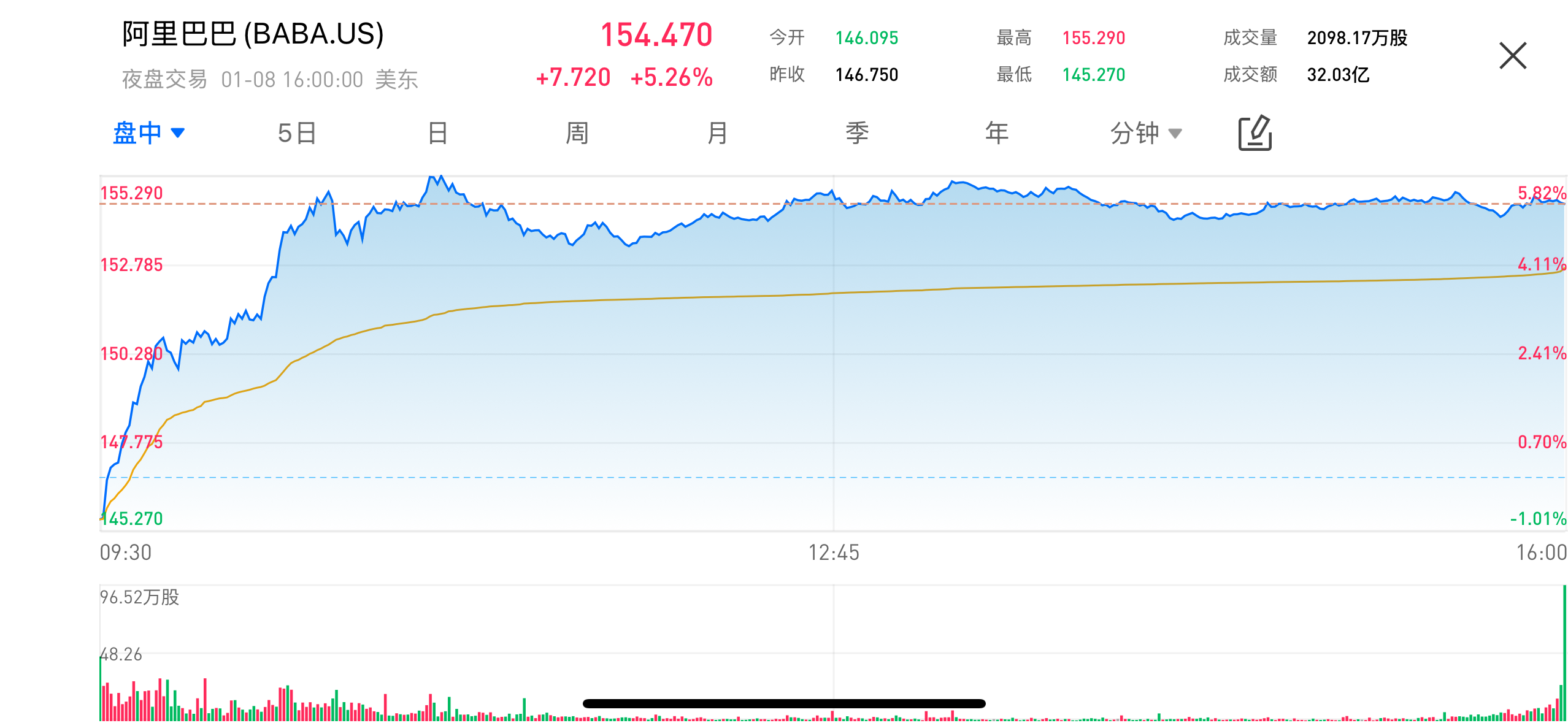 On January 8, 2026, Alibaba's (BABA.US) stock price saw a strong rebound, closing at $154.47, up $7.72 from the opening price, reflecting a 5.26% increase. The surge in stock price is attributed to the company's growing maturity in its AI, cloud computing, and smart hardware strategies, which have boosted investor confidence.