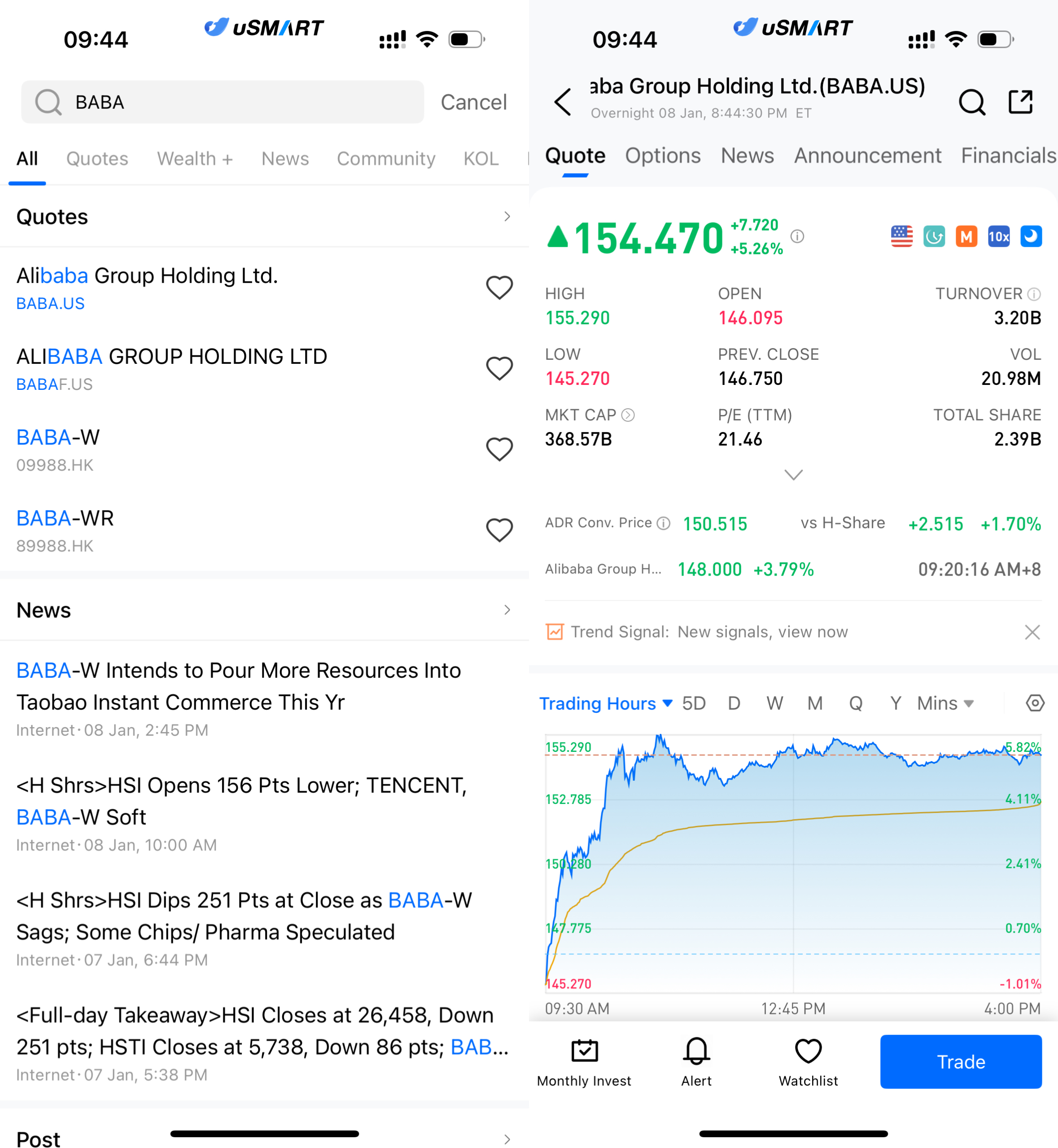 After logging into the uSMART HK app, click the “Search” button in the top-right corner of the page, enter the ticker code (BABA.US), and navigate to the details page to view transaction details and historical trends. Click the “Trade” button in the bottom-right corner, select the trade type, and submit your order after filling in the transaction conditions.
