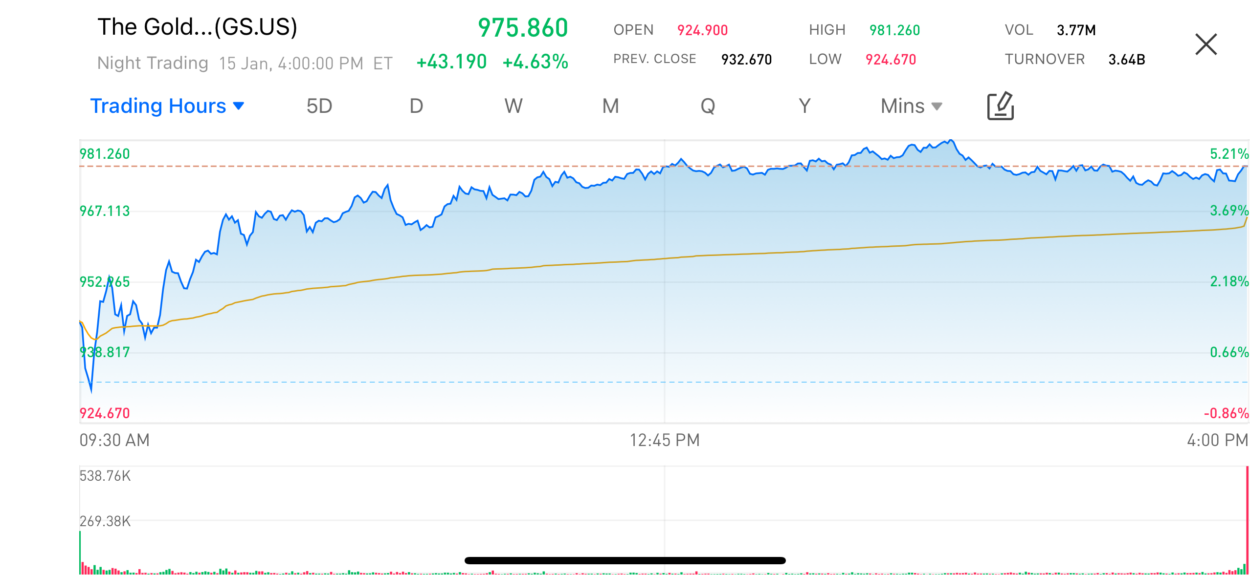 On January 15, 2026, Goldman Sachs Group (GS.US) saw a significant surge in its stock price, closing at $975.86, up 4.63%. The stock price climbed from an opening price of $924.90, reaching a high of $981.26, reflecting the market's positive reaction to the company's Q4 2025 earnings report. This rise in stock price not only reflects the impressive financial performance but also signals strong market confidence in Goldman Sachs' future growth prospects.
