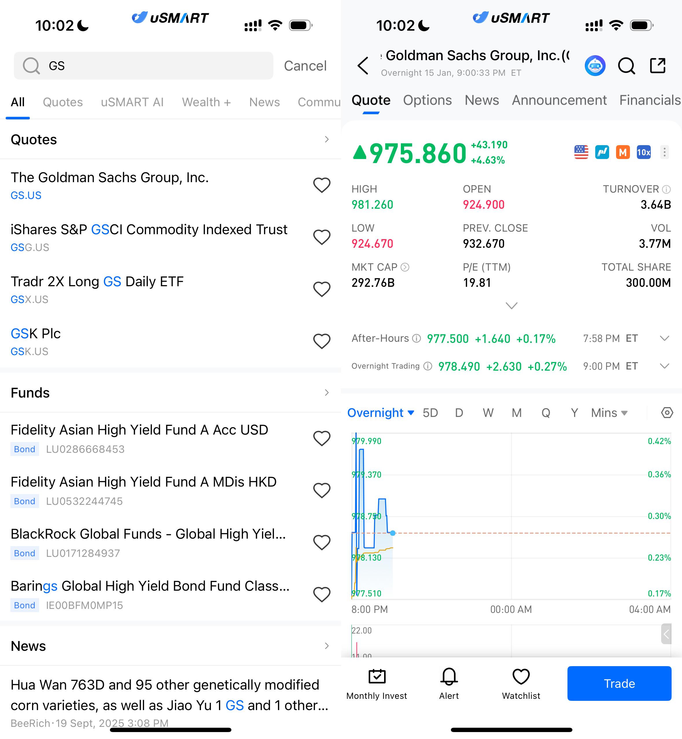 After logging into the uSMART HK app, click the “Search” button in the top-right corner of the page, enter the ticker code (GS.US), and navigate to the details page to view transaction details and historical trends. Click the “Trade” button in the bottom-right corner, select the trade type, and submit your order after filling in the transaction conditions.