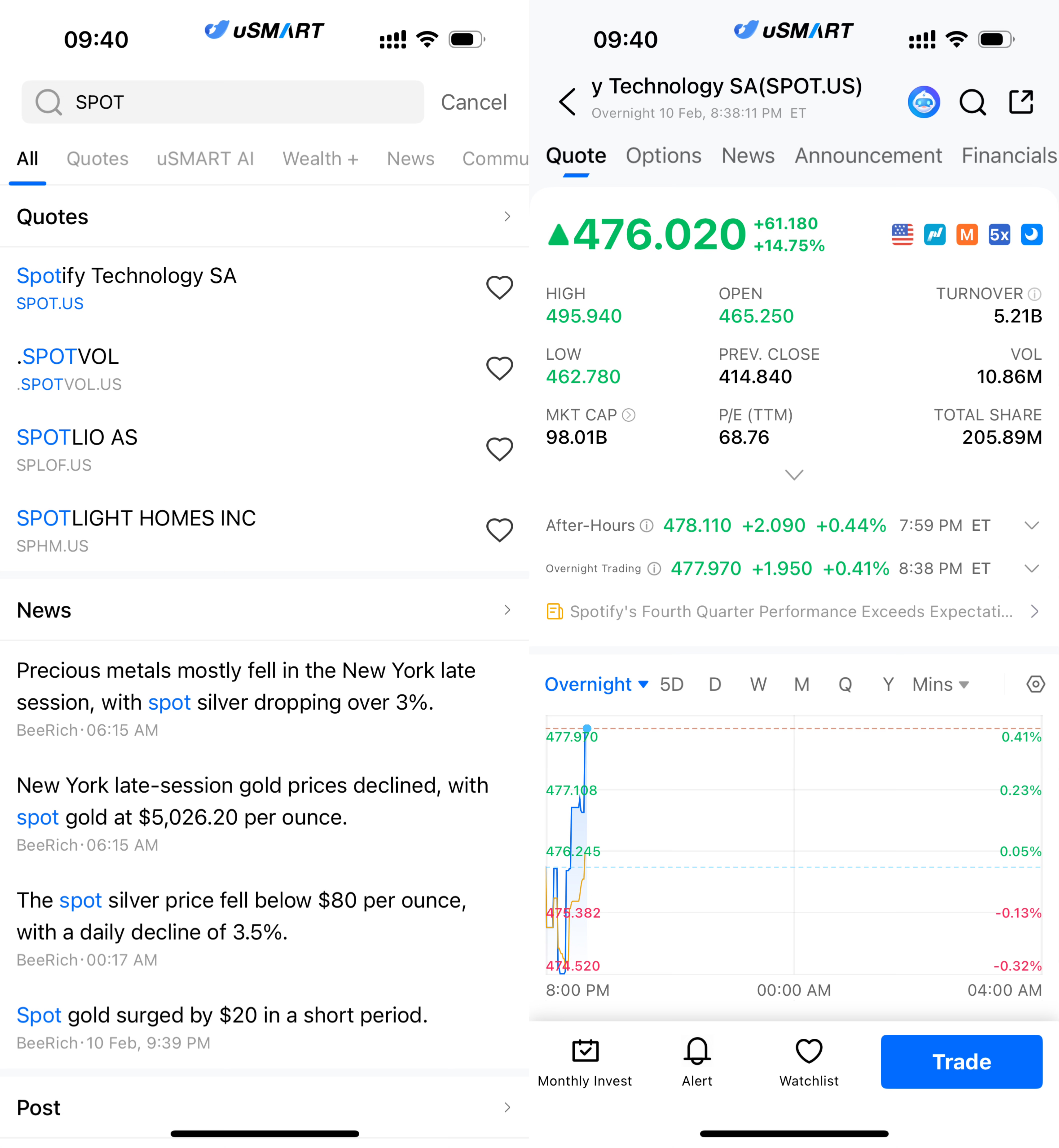 After logging into the uSMART HK app, click the “Search” button in the top-right corner of the page, enter the ticker code (SPOT.US), and navigate to the details page to view transaction details and historical trends. Click the “Trade” button in the bottom-right corner, select the trade type, and submit your order after filling in the transaction conditions.