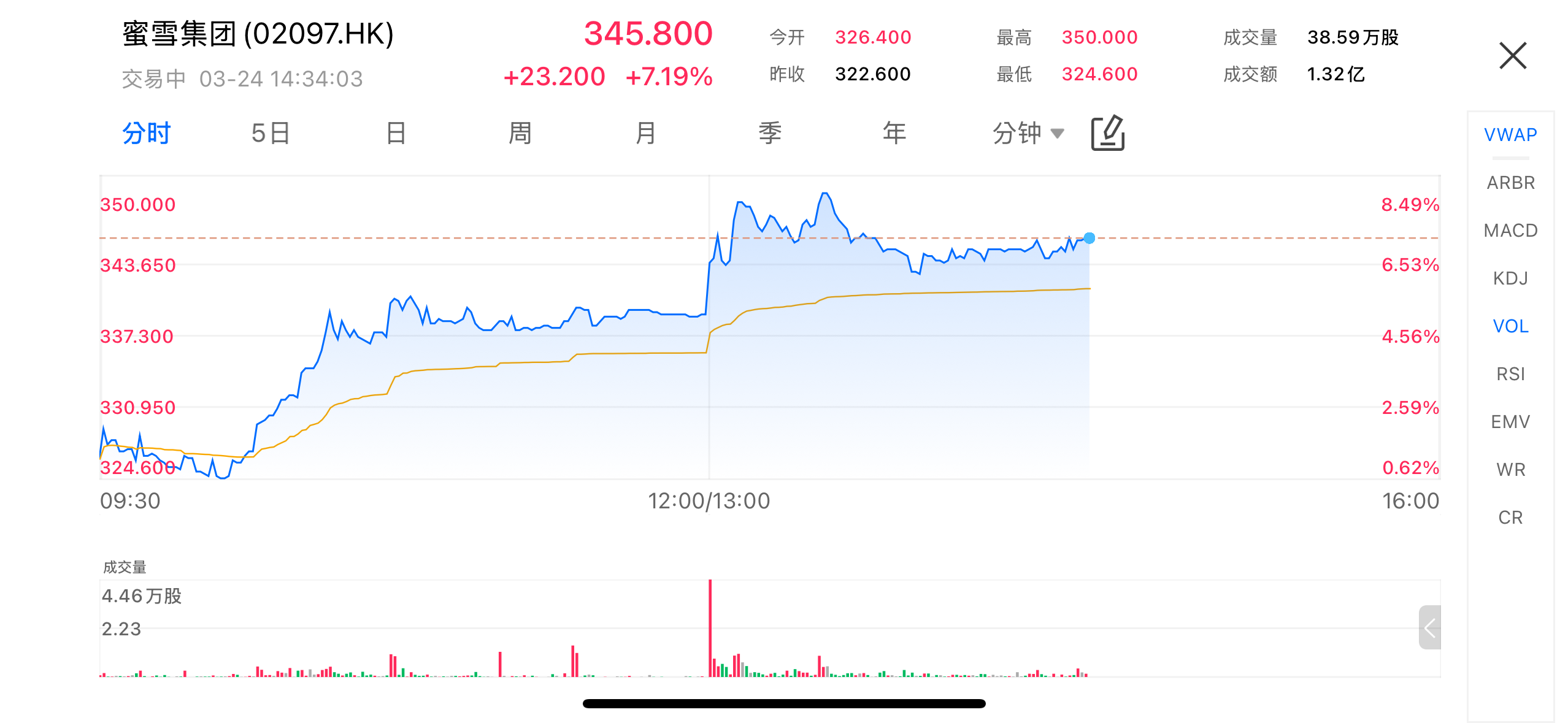 On March 24, following the release of its financial results, Mixue Group (02097.HK) shares surged. In early trading, the stock briefly pulled back to around HK$324, then gradually rebounded, and surged further in the afternoon following the earnings release, reaching an intraday high of HK$350, up nearly 8.5%. As of the indicated time, the stock closed at HK$345.8, up 7.19%.