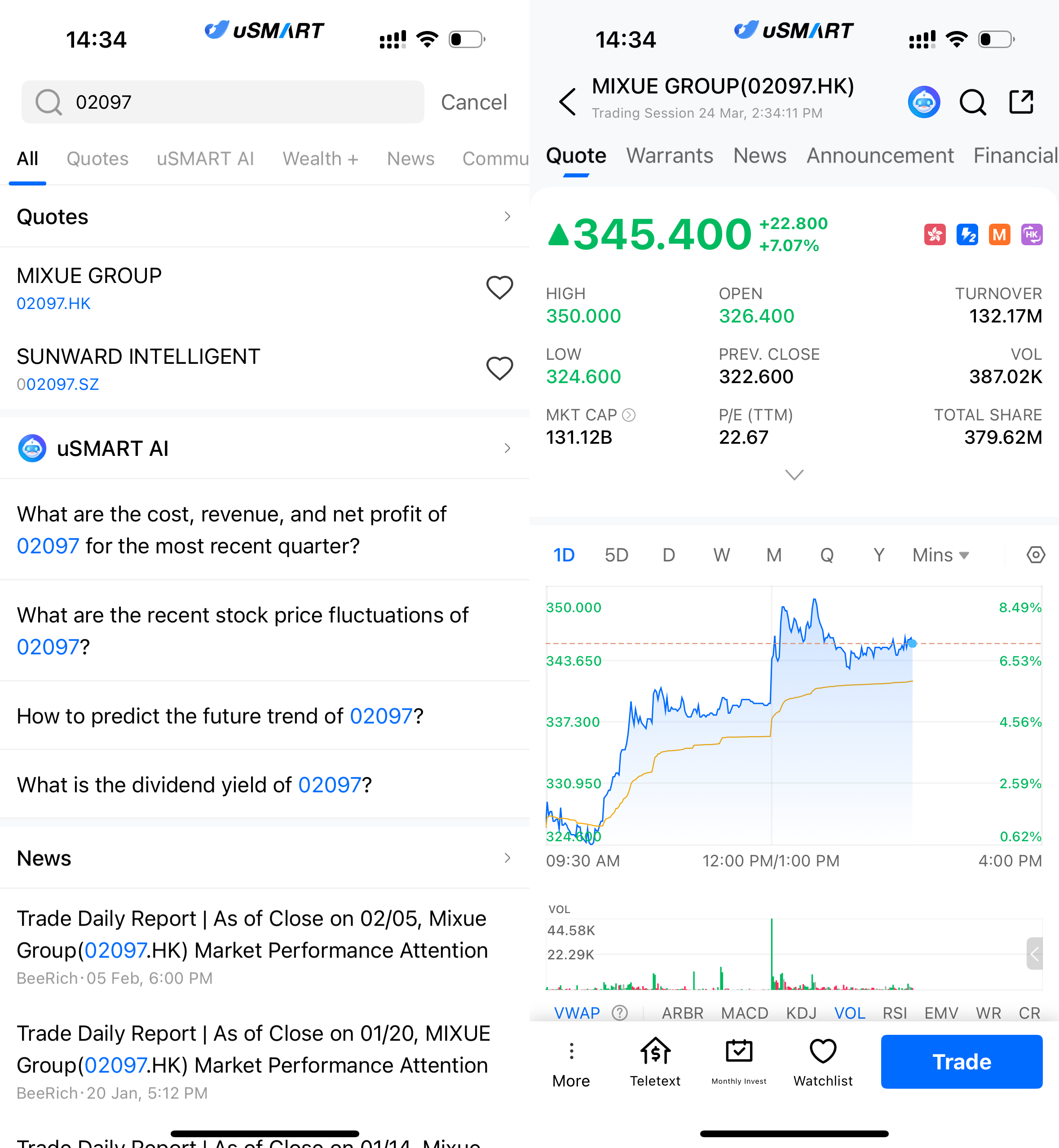 After logging into the uSMART HK app, click the “Search” button in the top-right corner of the page, enter the ticker code(02097.HK), and navigate to the details page to view transaction details and historical trends. Click the “Trade” button in the bottom-right corner, select the trade type, and submit your order after filling in the transaction conditions.