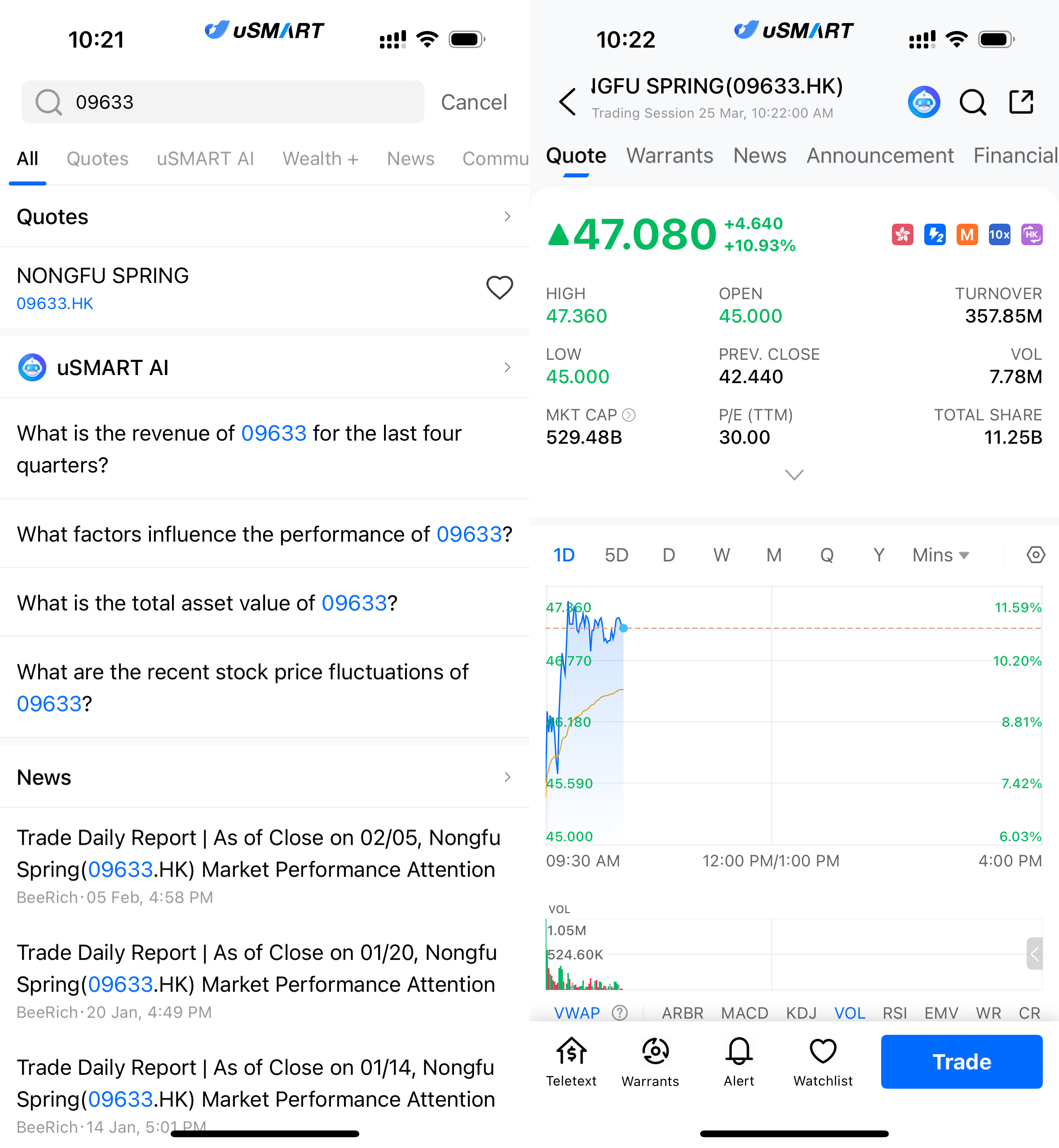 After logging into the uSMART HK app, click the “Search” button in the top-right corner of the page, enter the ticker code(09633.HK), and navigate to the details page to view transaction details and historical trends. Click the “Trade” button in the bottom-right corner, select the trade type, and submit your order after filling in the transaction conditions.