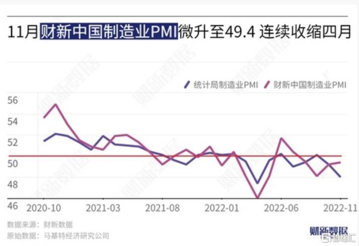 11月財新中國製造業PMI微升至49.4,繼續處於收縮區間,就業指數降至2020年3月以來最低