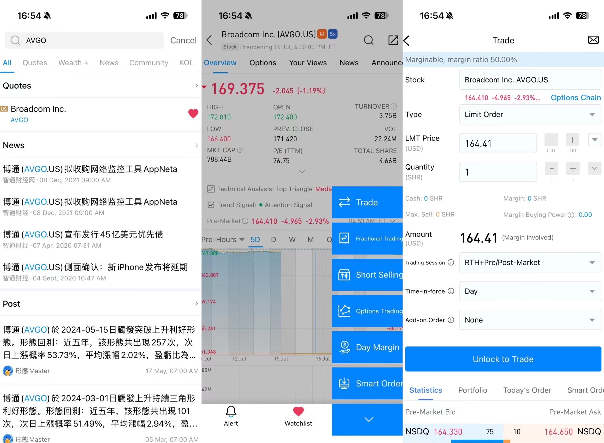 After logging into uSMART HK APP, click "Search" from the upper right corner of the page and enter "AVGO" to enter the details page to learn about transaction details and historical trends. Click "Trade" in the lower right corner and select the "Buy/Sell" function. Finally, fill in the transaction conditions and send the order; the image operation instructions are as follows: