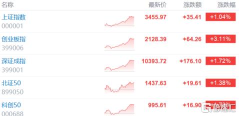 滬指3連升,收漲1.04%報3455.97點,創2024年12月12日以來新高;創業板指收漲3.11%,深證成指收漲1.72%;上證50、滬深300、北證50、科創50指數均漲超1%。