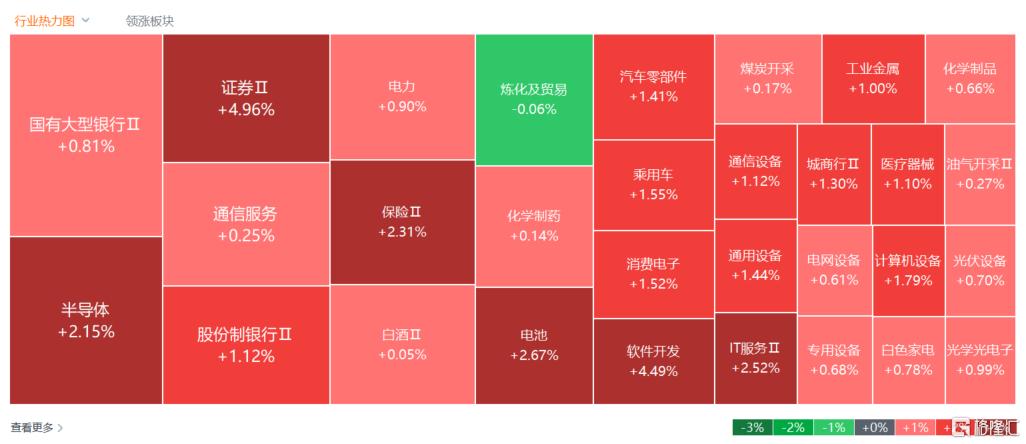 大金融繼續發力,券商板塊大爆發,國盛金控、湘財股份2連板,東方財富、天風證券漲停。消息面上,央行等六部門聯合印發《關於金融支持提振和擴大消費的指導意見》指出,健全投資和融資相協調的資本市場功能,推動中長期資金入市,促進資本市場穩定發展。另外,國泰君安國際正式獲香港證監會批準,將現有證券交易牌照升級爲可提供虛擬資產交易服務。