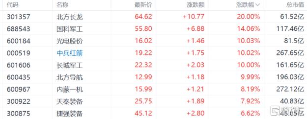 地面兵裝、航天航空、軍工電子等板塊大漲,北方長龍、中兵紅箭、長城軍工、中天火箭等多股漲停。消息面上,我國將於9月3日上午,在北京天安門廣場舉行抗日戰爭暨世界反法西斯戰爭勝利80週年大會,包括檢閱部隊。