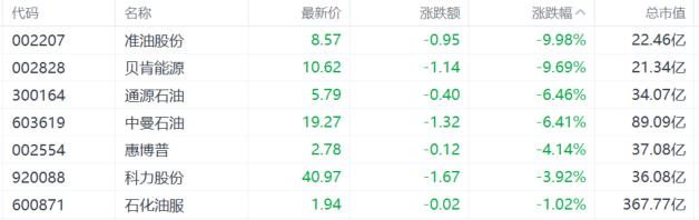 油氣股延續跌勢,準油股份跌停,貝肯能源跌超9%,通源石油、中曼石油跌超6%。消息面上,伊以全面停火預期之下,中東地緣局勢降溫,原油系再次下挫。國際原油期貨價格大幅下跌,WTI和布倫特原油期貨分別下跌超過6%。