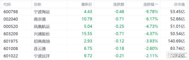 航運港口板塊下挫,寧波海運跌超9%,南京港跌超6%,鳳凰航運、興通股份得超4%,招商南油跌超3%。此前伊朗威脅關閉霍爾木茲海峽導致運價飆升,不過日前伊以衝突宣告結束,地緣風險溢價持續擠出。
