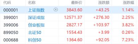 A股主要指數今日早盤小幅震盪,尾盤拉昇衝高;截至收盤,滬指漲1.14%報3843點,深證成指漲2.25%,創業板指漲3.82%,科創50指數漲7.23%。全天成交額3萬億元,較前一交易日縮量1969億元。全市場超2800股上漲。