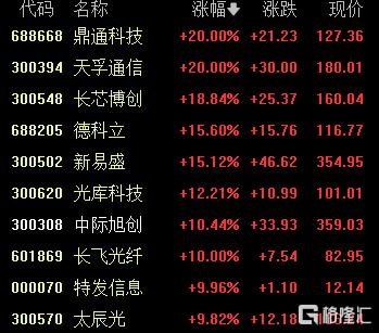 CPO、衛星通信概念股大漲,鼎通科技、天孚通信20cm漲停,長芯博創漲超18%,德科立、新易盛漲超15%,中際旭創漲超10%,長飛光纖、特發信息10cn漲停。