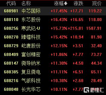 半導體股全線走強,中芯國際漲超17%,東芯股份漲超16%,寒武紀漲超15%,富創精密、微導納米、復旦微電漲超11%。