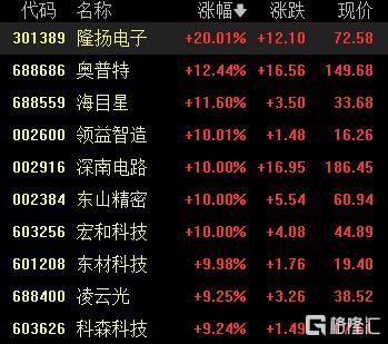 蘋果概念震盪走高,隆揚電子20cm漲停,奧普特漲超12%,海目星漲超11%,領益智造、深南電路、東山精密、宏和科技10cm漲停。