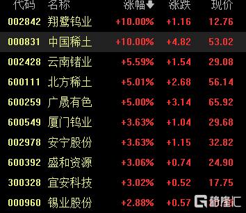 小金屬股表現活躍,中國稀土漲停,雲南鍺業、北方稀土、廣晟有色漲超5%,廈門鎢業、盛和資源等跟漲。