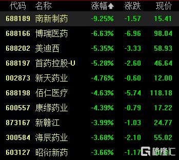 創新藥概念股連續第三日集體回調,南新制藥跌超9%,博瑞醫藥跌超6%,美迪西、首藥控股跌超5%。