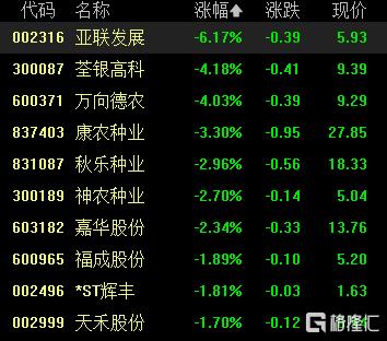 糧食概念表現弱勢,亞聯發展跌超6%,荃銀高科、萬向德農跌超4%,康農種業、神農種業、嘉華股份等跟跌。