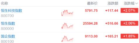 截至發稿,恆指、恆科指均漲超2%,國企指數漲1.85%。