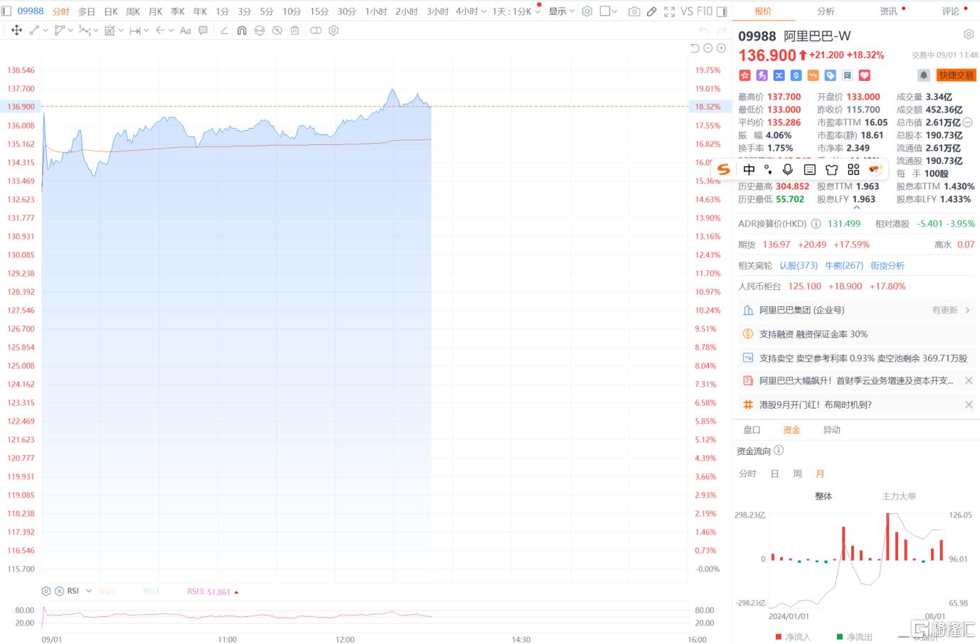盤中其股價猛飆超18%現報136.9港元,錄得自2022年11月以來的最大盤中漲幅,現總市值達2.61萬億港元。