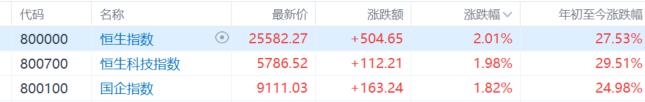 截至目前,恆指累漲超27%,恆科指累漲超29%,國指累漲近25%。