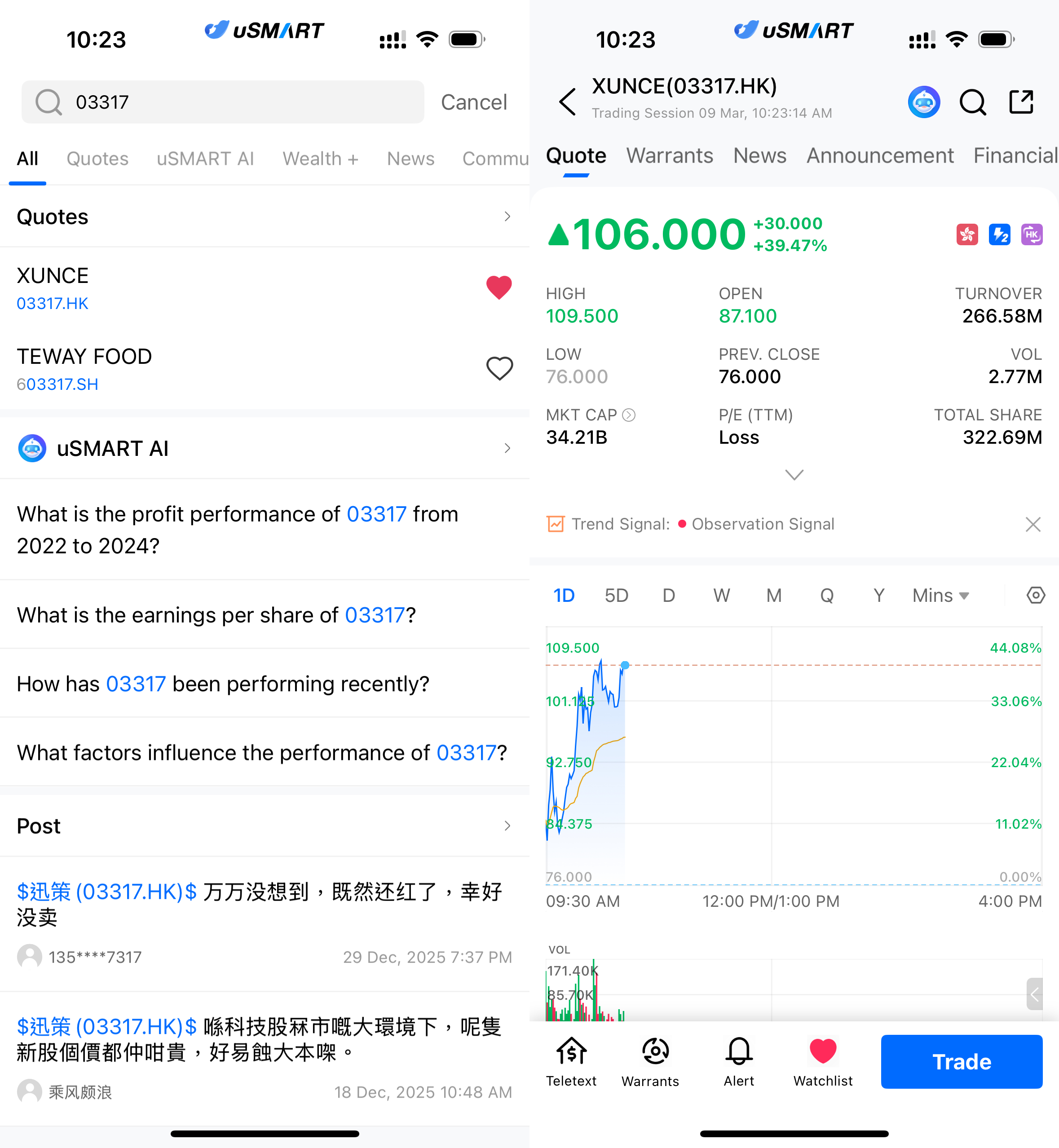 After logging into the uSMART HK app, click the “Search” button in the top-right corner of the page, enter the ticker code (03317.HK), and navigate to the details page to view transaction details and historical trends. Click the “Trade” button in the bottom-right corner, select the trade type, and submit your order after filling in the transaction conditions.
