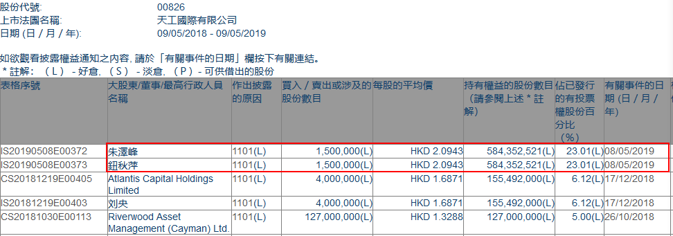 天工国际(00826.HK)获朱泽峰及钮秋萍增持150万股