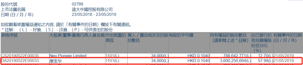 格隆汇获悉,根据港交所最新权益披露资料显示,2019年5月21日,远大中国(02789.HK)获康宝华以每股均价0.1040港元,增持3.4万股,总价约3536港元。