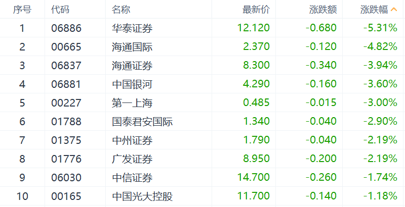 中资券商股连涨两日之后回落,板块内华泰证券(6886.HK)大跌5.31%,海通证券(6837.HK)、中国银河(6881.HK)、第一上海等跌幅紧随其后。