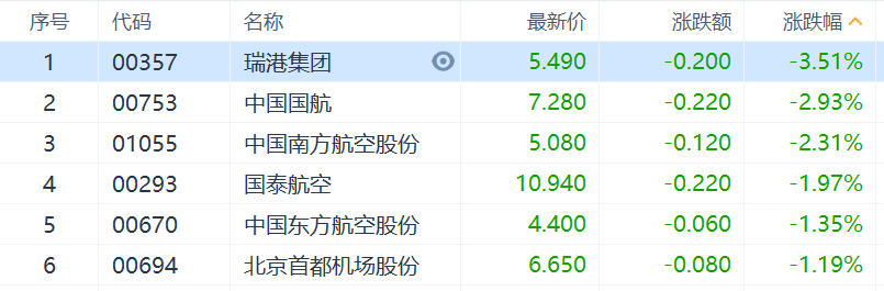 航空股全线下挫,其中瑞港集团(0357.HK)以3.51%的跌幅领跌,国航(0753.HK)跌2.93%,南航(1055.HK)跌2.31%。