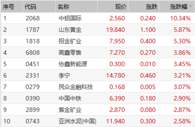 1.从港股通个股涨跌幅表现看,今日港股通标的中涨幅前五的个股分别是:中铝国际(2068.HK)、山东黄金(1787.HK)、招金矿业(1818.HK)、高鑫零售(6808.HK)、协鑫新能源(0451.HK)。