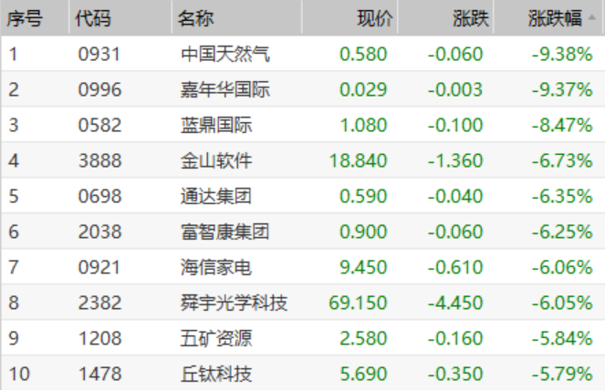跌幅前五的个股分别是:中国天然气(0931.HK)、嘉年华国际(0996.HK)、蓝鼎国际(0582.HK)、金山软件(3888.HK)、通达集团(0698.HK)。