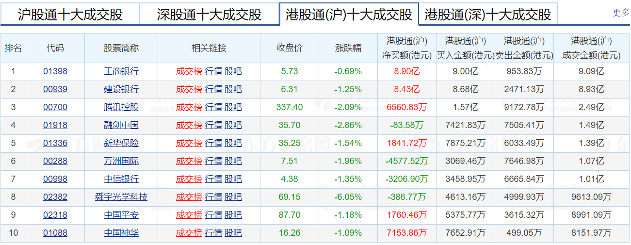 龙虎榜数据显示,今日港股通(沪)前十大成交个股是工商银行、建设银行、腾讯控股、融创中国、新华保险、万洲国际、中信银行、舜宇光学科技、中国平安、中国神华。其中净流入最多的个股是工商银行,净流入8.9亿港元;净流出最多的个股是万洲国际,净流出4577.52万港元。