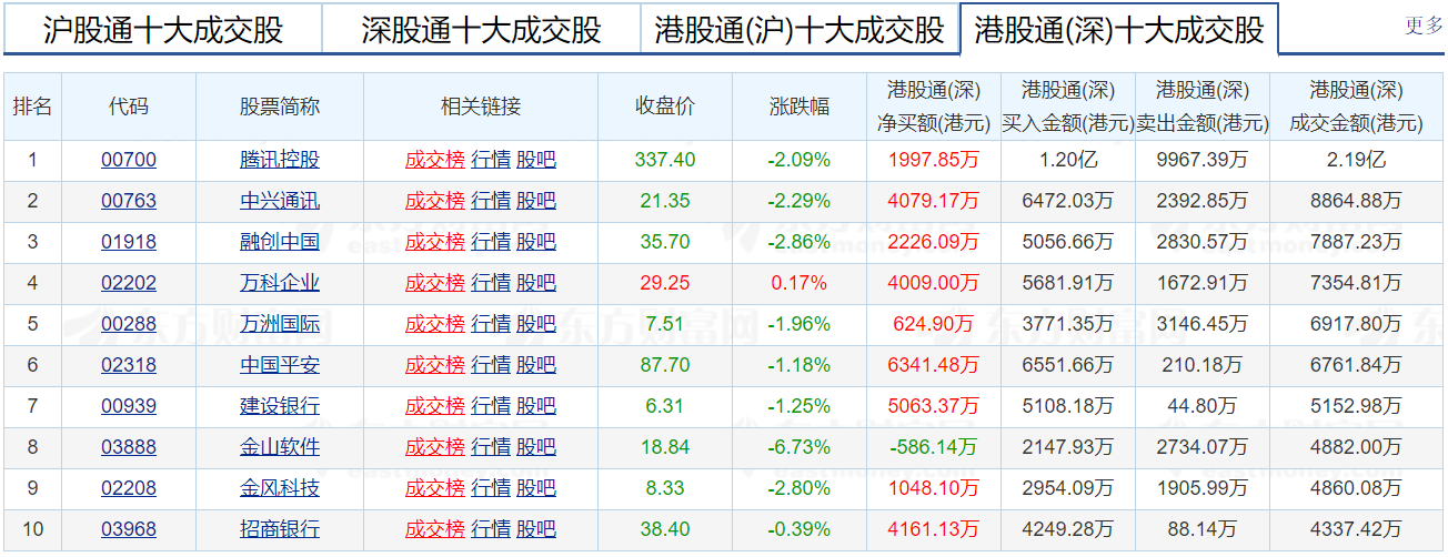 今日港股通(深)前十大成交个股是腾讯控股、中兴通讯、融创中国、万科企业、万洲国际、中国平安、建设银行、金山软件、金风科技、招商银行。其中净流入最多的个股是中国平安,净流入6341.48万港元;净流出最多的个股是金山软件,净流出586.14万港元。
